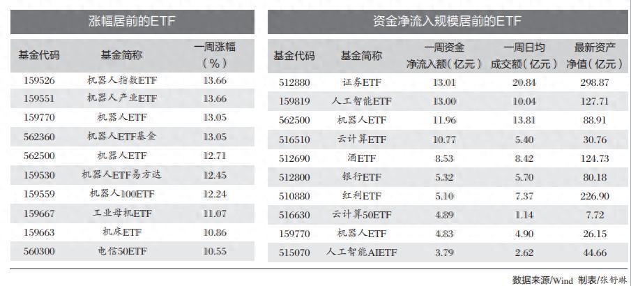 上周A股市场火热,机器人、芯片等板块强势大涨。机器人指数ETF、工业母机ETF、科创芯片ETF博时等涨幅超过10%。